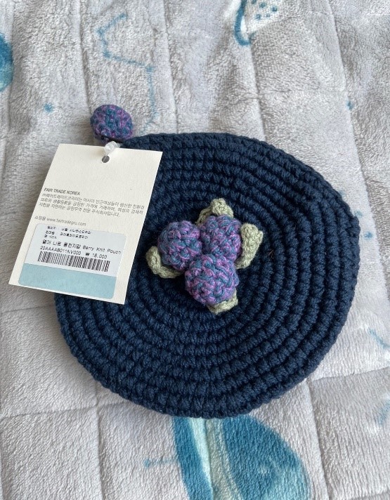 열매 니트 동전지갑, 색상이 공정무역 판매처 사진과 같았고, 크기는 생각보다 컸습니다. 기성품보다 약간 투박하다는 느낌을 받았지만, 만듦새는 좋은 상품이었습니다. 특히 포도 모양의 장식이 심심함을 덜어주었습니다. 안감이 부드러워 무선이어폰을 넣는 등 다용도로 사용해보려 합니다.