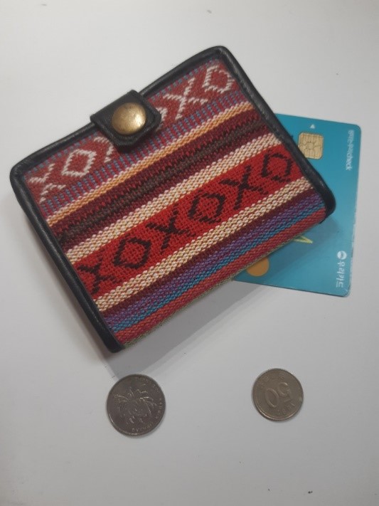 사나만의 독특한 디자인에 이끌렸습니다. 핸드메이드 상품이라 패턴이 달라질 수 있다고 했는데, 위치만 달라질 뿐, 사이트에 있는 패턴과 동일했습니다. 카드, 동전, 지폐의 충분한 수납이 가능합니다. 재질이 물로 헹구는 것만으로도 세탁이 가능하여 오래 사용할 수 있을 것 같습니다.